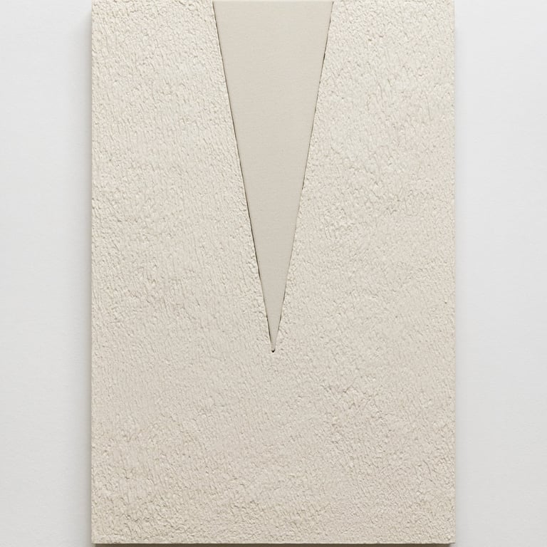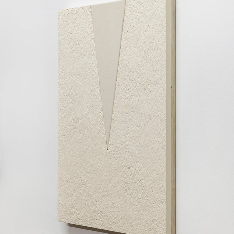 Night Triangle (2025) Unprimed canvas, emulsion and lacquer on Artex, MDF, reclaimed plywood, 60 x 40 x 4 cm